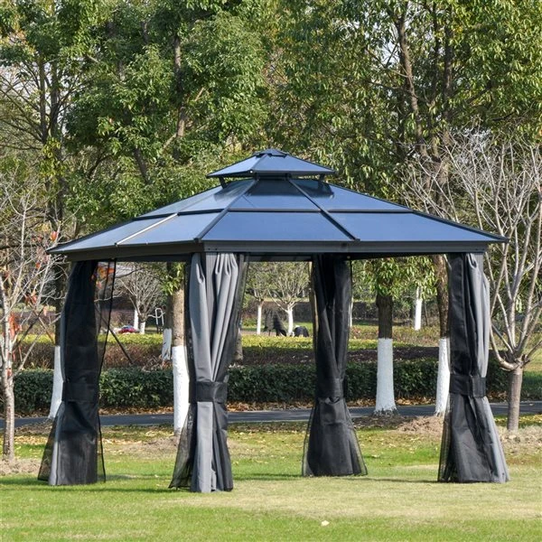 Cet abri de jardin à toit rigide est votre meilleur choix pour vous détendre et profiter des célébrations. Ses grandes dimensions offrent un abri adapté pour vous et plusieurs autres personnes. Vous pouvez installer cet abri dans la cour ou au bord de la piscine, et organiser une réunion agréable avec vos amis ou votre famille. Laissez cet abri de jardin pratique améliorer votre bien-être et votre qualité de vie.Abri de jardin pratique au design haut et spacieuxCadre en acier et aluminium pour une structure stableToit rigide en polycarbonate pour une protection contre les rayons UVToit à deux niveaux permettant une bonne circulation de l’airParois latérales et rideaux en maille respirante créant un espace confortable