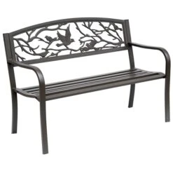-Un fini durable en acier thermolaqué avec un dossier en fonte offre un cadre solide et confortableCe siège avec accoudoirs peut asseoir 2 personnes et supporter jusqu’à 615 lbLe dossier à motif d’oiseau vieilli crée un banc de parc confortable, en plus d’être une magnifique décoration ou une pièce maîtresse pour un jardin ou un patioAjoute une touche d’élégance à tout espace, incluant la cour avant, la cour arrière ou le patioLa conception en lattes du siège permet à l’eau de pluie de s’évacuer rapidement créant ainsi un banc d’extérieur en fonte facile à entretenir
