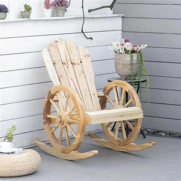 Imaginez-vous en train vous balancer d’avant en arrière sous le soleil dans cette berceuse Adirondack. Les accoudoirs en forme de roue de chariot apportent un aspect chaleureux rétro. Profitez d’une journée de détente sur votre porche d’entrée, votre patio, votre terrasse ou dans votre jardin, avec cette classique et confortable chaise.Les accoudoirs présentent un design unique de roue de chariotFabriquée en bois de sapin naturel robuste et résistant aux intempériesLarge siège, accoudoirs ergonomiques et dossier ergonomique pour un confort optimalConception de lattes permettant à l’eau de pluie de s’écouler rapidementCadre robuste