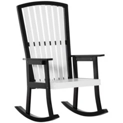 Chaise berçante Outsunny en bois noir avec siège à lattes blanchesLarge siège, accoudoirs et haut dossier à lattes pour une position confortableRecouverte de PU pour résister à la lumière et une protection contre les UVRecouverte de PU pour une solidité à la lumière et une protection contre les UV
