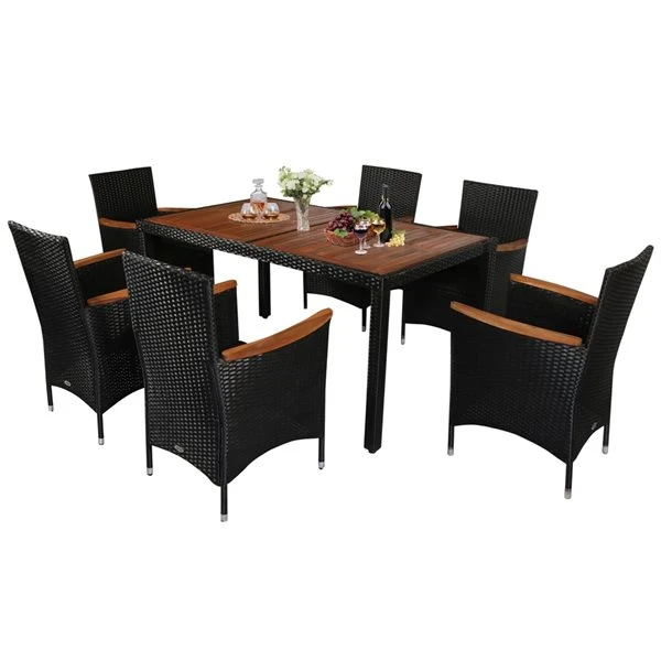 Ensemble à dîner pour patio Outsunny en rotin de PE noir avec coussins crèmes, 7 piècesComprend 6 chaises rembourrées et 1 table avec un dessus en acaciaConstruit à partir d’osier en PE résistant aux intempéries sur un cadre en acier résistant aux intempéries et un dessus en bois d’acacia sur la table et les accoudoirs des chaisesLes chaises sont dotées de dossiers hauts et de sièges larges dotés de coussins rembourrés en mousse pour plus de confort et de soutienFacile à entretenir : vous pouvez essuyer l’ensemble de table à manger avec un chiffon humide pour le nettoyage quotidien et les housses de coussin sont amovibles pour un lavage facileDimensions de la table : 59 po L. x 35,5 po l. x 29,5 po h.Dimensions de la chaise : 22,75 po L. x 22,75 po l.. x 34,75 po h.Hauteur du sol au siège (sans coussin) : 16,25 poAssemblage facile