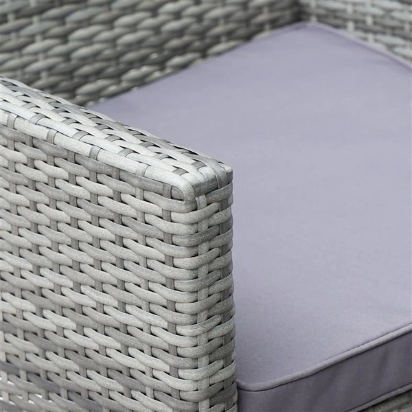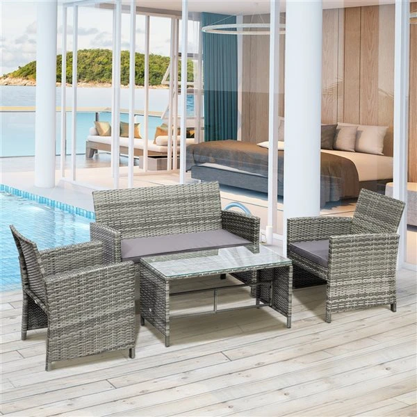 Illuminez votre jardin avec un ensemble de meubles en rotin d’Outsunny et rendez l’extérieur de votre maison aussi accueillant que l’intérieur. Cet ensemble de patio pour l’extérieur est élégant, à la mode et présente un design moderne et une construction solide. Il est fabriqué avec une structure métallique de haute qualité enveloppée d’osier PE de fabrication exquise, imperméable et adapté à un usage intérieur et extérieur.Ensemble de 4 pièces en rotinCadre en métal solide de haute qualité enveloppée d’osier PE Résine tressée résistante aux intempéries et facile à nettoyerTissu en polyester résistant aux UV et verre trempé résistant pour plus de durabilitéCoussins rembourrée d’éponge épaisse et de coton PP pour un confort supérieur