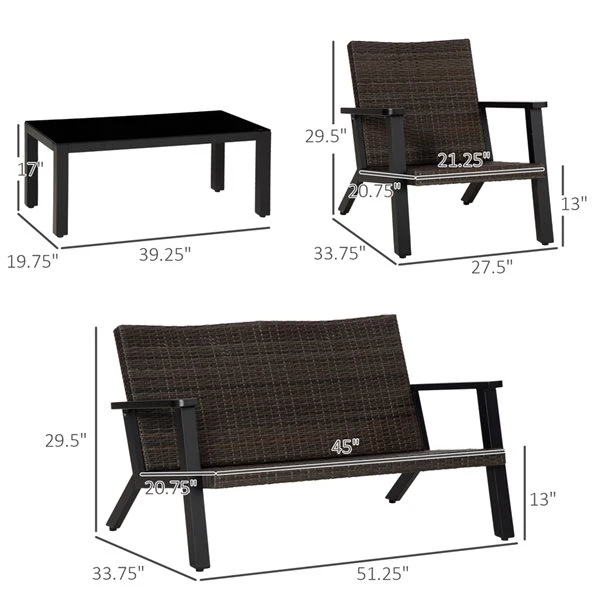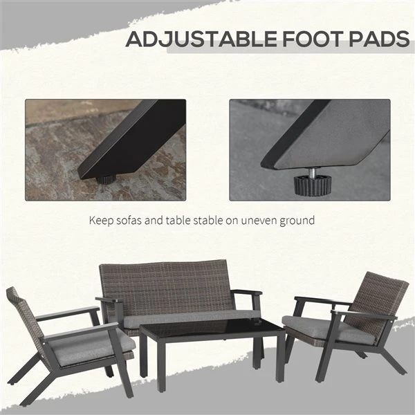 Égayez votre espace extérieur avec cet ensemble de mobilier en rotin 4 pièces d’Outsunny. Cet ensemble décoratif et fonctionnel contribue à rendre l’espace extérieur aussi attrayant que l’intérieur.Cet ensemble de meubles d’extérieur en rotin de 4 pièces comprend 2 canapés simples, 1 canapé double et 1 table à théFabriqué à partir d’aluminium robuste et d’osier, cet ensemble peut résister à l’épreuve du temps et des températures élevéesLa housse du coussin est munie d’une fermeture éclair, elle est détachable et facile à nettoyerLes pattes sont réglables à la base pour ajuster légèrement la hauteur des canapés et de la table afin de garantir l’équilibre sur un sol irrégulierCanapé double : 51,25 po x 33,75 po p. x 29,5 po h.