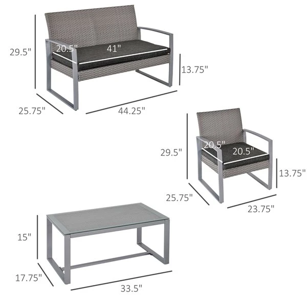 Égayez votre espace extérieur avec cet ensemble de mobilier en rotin 4 pièces d’Outsunny. Cet ensemble décoratif et fonctionnel contribue à rendre l’espace extérieur aussi attrayant que l’intérieur.Cet ensemble comprend 2 canapés simples, 1 canapé double et 1 table à théFabriqué à partir d’un cadre métallique thermolaqué et de pattes en métal, avec de l’osier élégant de haute qualitéLes housses de coussin sont munies d’une fermeture éclair pour être facilement retirées et lavéesdéal pour différentes occasions, convient parfaitement pour le jardin, le patio, le bord de la piscine et tout autre espace approprié dans votre maisonDimension du canapé simple : 23,75 po l. x 25,75 po p. x 29,5 po h.