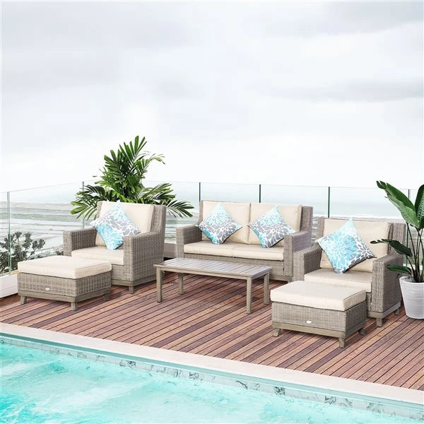Vous souhaitez ajouter des meubles modernes à votre espace extérieur ? Cet ensemble de mobilier extérieur en rotin d’Outsunny est votre meilleur choix pour rendre l’extérieur de votre maison aussi invitant que l’intérieur. Cet ensemble comprend deux poufs et une table basse. Décoratif et fonctionnel, il crée un cadre invitant dans votre jardin.Cet ensemble comprend une causeuse, 2 fauteuils, 2 poufs et une grande table basseCadre en aluminium léger enveloppé de rotin en PE pour une utilisation durableCoussins de siège et de dossier rembourrés pour un confort optimalHousses de coussin avec fermetures à glissière pour un retrait et un lavage facilesLe dessus de la table est constitué d’un panneau en aluminium élégant et léger