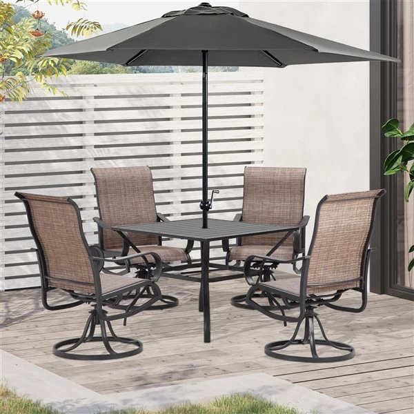 Un patio ennuyeux? Égayez votre jardin avec l’ensemble table et chaises d’extérieur Outsunny et rendez l’extérieur de votre maison aussi accueillant que l’intérieur. Souvent, en raison de sièges inconfortables ou simplement d’un manque de mobilier, de nombreux environnements extérieurs sont sous-utilisés ou complètement ignorés. Outsunny pense que vous pouvez changer cela en investissant de manière économique dans l’un des ensembles de meubles d’extérieur design.Ensemble de 5 pièces, comprenant 4 fauteuils et 1 table assortieLa fonction bascule et pivotement à 360° apporte un grand confort et une grande commoditéConstruit avec un trou pour parasol de 40 mm de diamètre au centre de la tableParfait pour les cours, les jardins, les balcons, les terrasses et autres espaces extérieursLe tissu à maille de la chaise assure une grande respirabilité et un grand confort