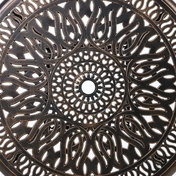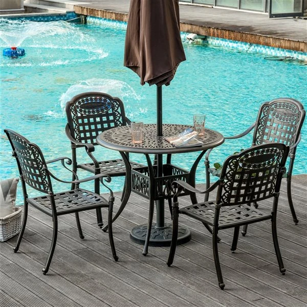 Comprend 4 chaises et 1 table ronde assortieParfait pour votre espace extérieurConstruit avec un trou de 2 po de diamètre au centre de la table pour installer un parasolConçu avec une forme profilée et des accoudoirs incurvés pour un confort exceptionnelFabriqué en fonte d’aluminium pour une durabilité à long termeLes patins réglables assurent une stabilité sur les surfaces inégales