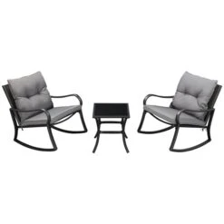 Fauteuils Berçants Et Table D’appoint Outsunny En Métal Noir Avec Siège Coussiné Gris, Ensemble De 3
