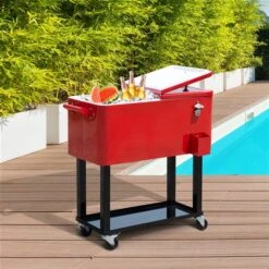 Glacière Sur Roulettes De 75 L En Acier Inoxydable Rouge Par Outsunny Avec Rangement Intégré